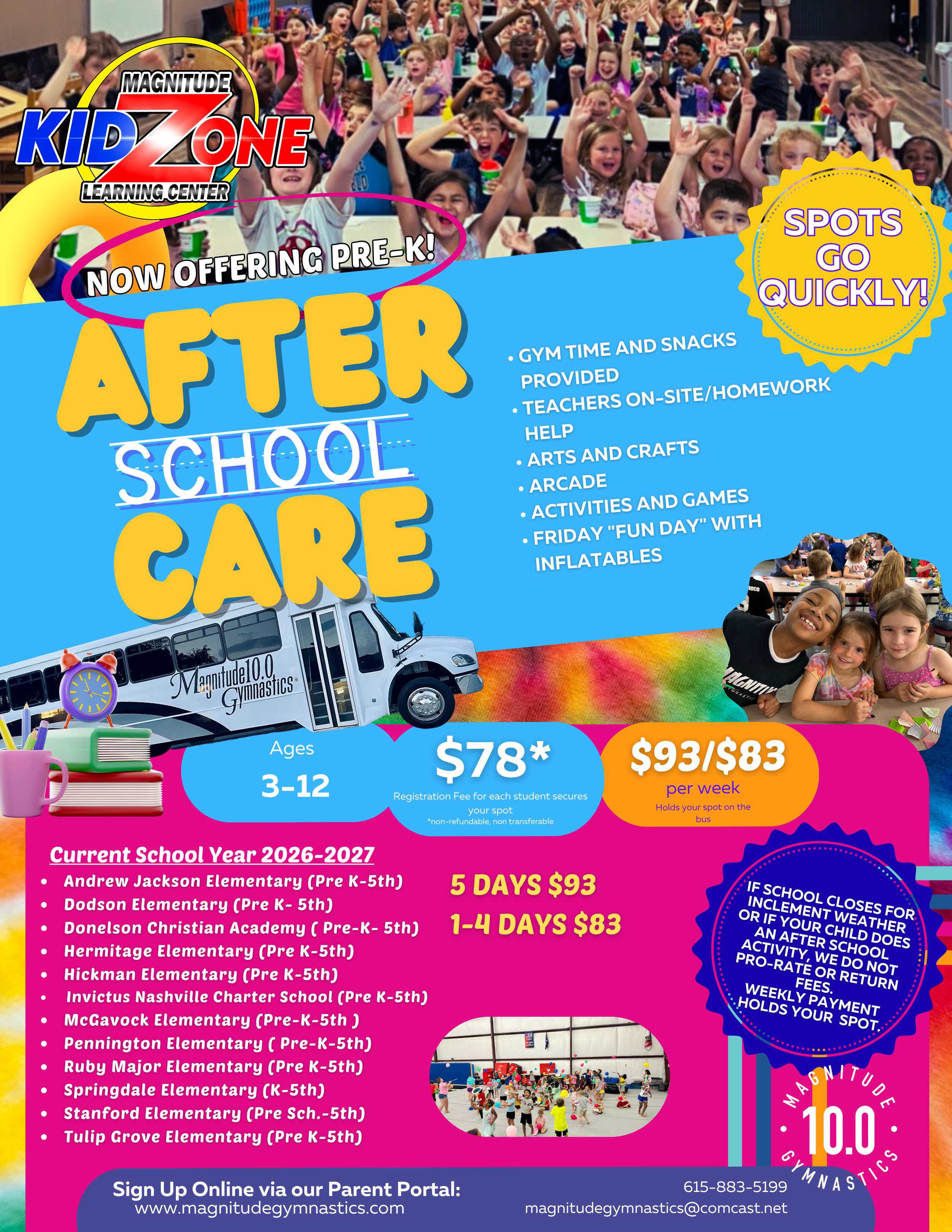 All payments are deducted via ACH or a card on file and will be charged the Monday of the week of service. Magnitude requires a guarantee form of payment to be left on file at all times. If your card is declined, or your payment is not received on time, an extra charge of $40 will apply. You are responsible to inform us by 1:00 p.m. (each day) if your child is absent from school and will not need to be picked up. If we are not informed, you will be charged an additional $25.
